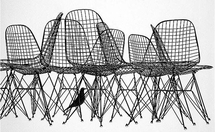 Charles & Ray Eames 1951 年發表的 Wire Chair 系列,以一片式有機網狀椅座,延伸變化出一系列不同椅腳及座墊搭配的單椅,這系列椅款輕巧透明的設計,在 60 年代可說是運用了當時最先進的技術來製作,靈感則是來自於鏤空的金屬收納籃,金屬條交織的椅座,彎曲的弧面不僅符合人體工學,在視覺上更具有穿透性。