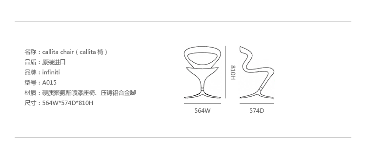 Callita Chair(Callita椅)是设计师Andreas Ostwald为Infiniti公司设计的。其非同寻常,令人惊叹的设计,Callita是您放飞想象力的最佳选择。一个动态和原始的想法,创造一个非常舒适的形状和一个鲜明的个性。Callita 脚椅的特点是具有光滑流线,并支起一个舒适的座椅,就像漂浮着一样。Callita 椅子旨在提供特别舒适的座椅,其舒适和充满活力的线条特别醒目,是最富有想象力工业设计。亭亭玉立,外观看似薄弱,但Callita 结构却是相当坚固的︰椅身是彩绘的硬质聚氨酯制成,用模铸铝制成四条辐射的脚架,并涂上与座位相同的颜色,浑然一体。黑色的Callita 椅子表示优雅精致;白色的Callita 代表了亮度和柔软性;红色时它变得生动和有吸引力。