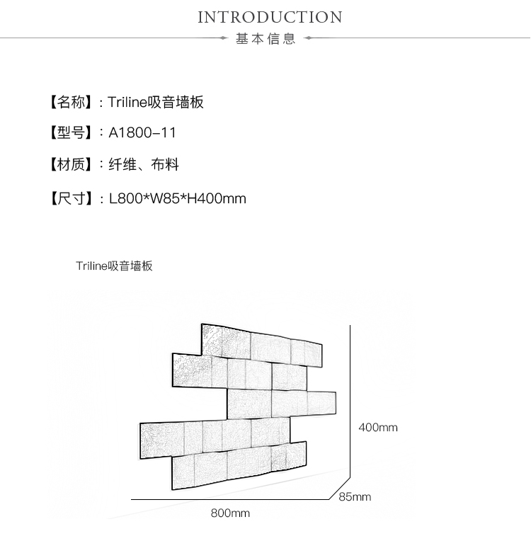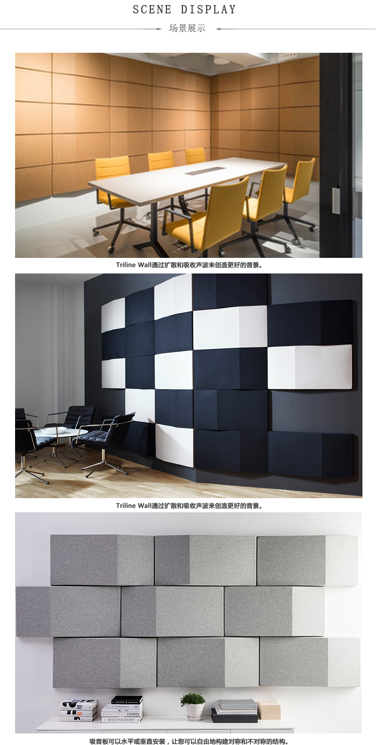 Triline Wall吸收并散发令人不快的声音反射,从而改善声学效果。由于模块具有直边,因此它们非常适合创建图案以覆盖大面积的墙面空间。每个模块包括安装在MDF板框架上的吸音再循环填充物。可见侧面采用羊毛织物装饰。该产品具有特有的三角形形状,可以打破击中模块的声波。由于采用隐藏式钢支架,产品可水平或垂直安装。