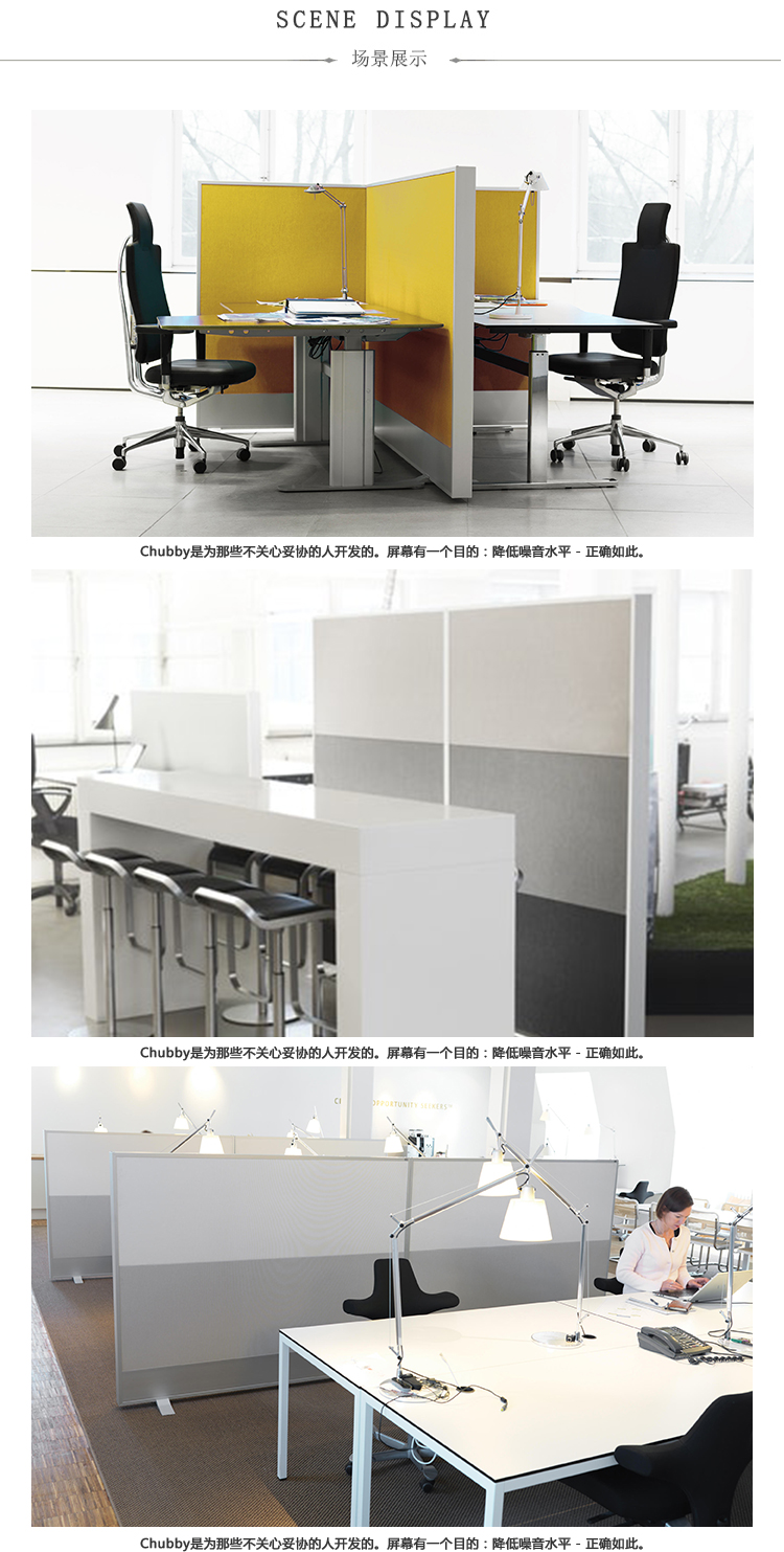 由于厚度为88毫米,Chubby可作为音障。它提供高达15 dB的声音降低!换句话说,一个非常好的吸声器,可以减少从一侧到另一侧的噪音。屏幕有多种类型; 有或没有玻璃,在同一个屏幕上有一个或多个面板。框架由阳极氧化铝制成。屏幕内有电缆准备好的通道。