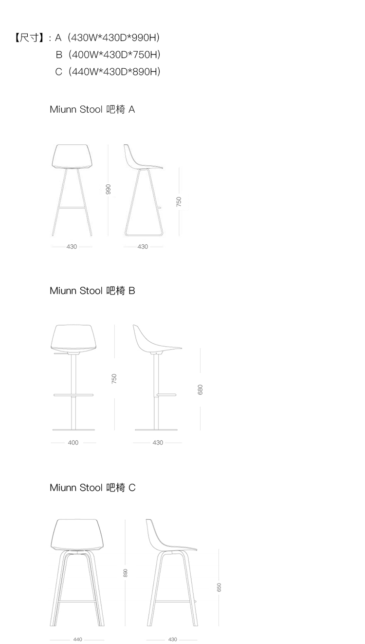 Miunn Stool 吧椅 系列尺寸/示意图