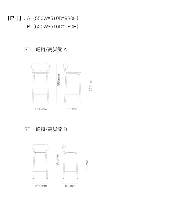 STIL 吧椅/高脚凳 系列尺寸/示意图