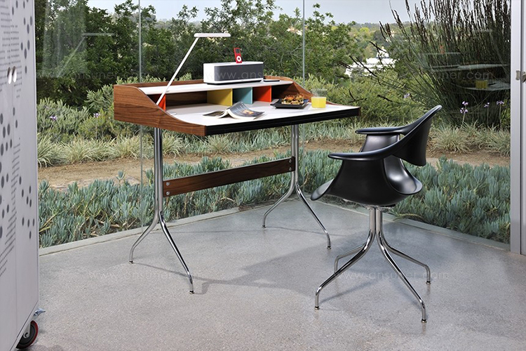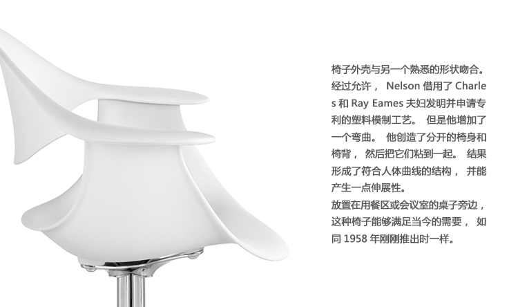 这款扶手椅所属系列的灵感来自George Nelson对创作一款具有雕刻感椅腿家具的渴望,并且他对椅腿的形状有非常具体的想法。George Nelson希望底座具有优雅的曲线,采用金属材料制造,工业加工成型,并且采用预处理饰面,同时要容易组装和分解,以方便装运,并且价格更便宜。型锻是用压力细化并弯曲金属管的过程。实践证明这是制造椅腿的绝好工艺,而Nelson也是用这种工艺为自己的独特设计命名。 对于椅座壳,Nelson将单独的椅座和靠背组合在一起,形成雕刻般的形状,以贴合人体曲线。椅背和椅身之间的缝隙可以避免产生过高的热量。宽阔平坦的扶手可以让手臂处于放松状态。放置在办公桌或是用餐区或会议室的桌子旁边,这款永恒时尚的座椅能够满足当今的需要,如同1958年刚刚推出时一样。