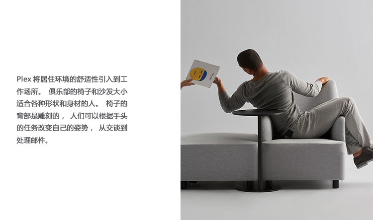 Plex将居住环境的舒适性引入到工作场所。俱乐部的椅子和沙发大小适合各种形状和身材的人。椅子的背部是雕刻的,人们可以根据手头的任务改变自己的姿势,从交谈到处理邮件。