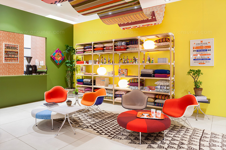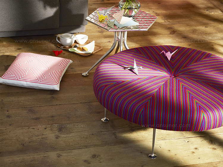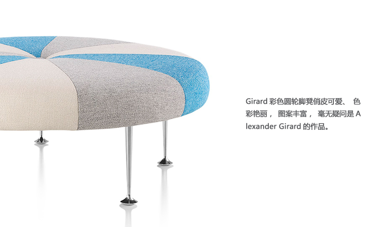 Girard彩色圆轮脚凳俏皮可爱、色彩艳丽,图案丰富,毫无疑问是Alexander Girard的作品。这段低矮的软垫休闲椅提供大胆靓丽的配色或醒目的条纹图案选择,可作为脚凳、咖啡桌、加座或者聊天椅。