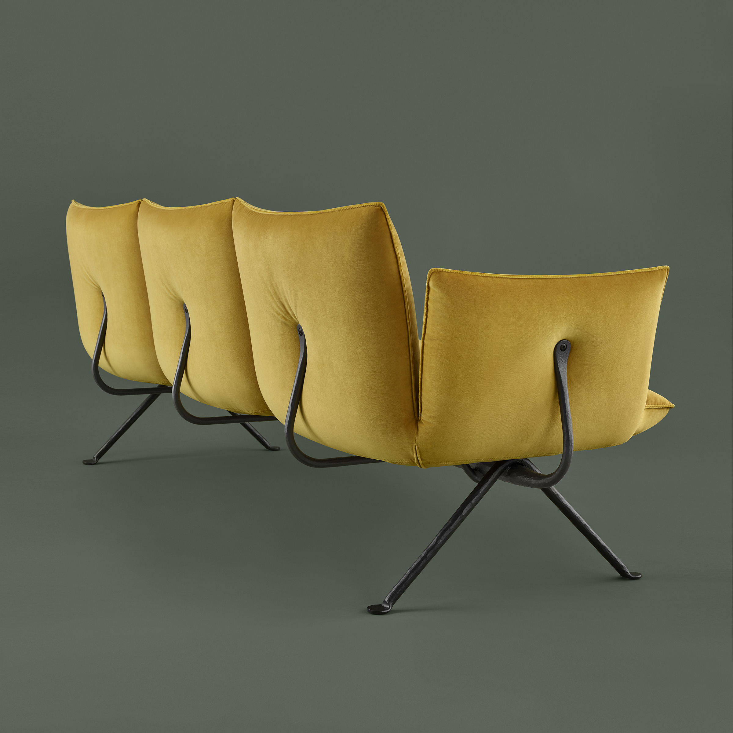 在桌子、椅子和凳子之后,收藏范围进一步扩大,包括一系列配件、一张低矮的椅子、一张双人长椅和一组软垫件(扶手椅、脚凳、两张和三人沙发)。所有这些作品都有一个伪造的铁结构,具有几百年来传承下来的原材料的魅力,充满活力,这些微小的缺陷使这个收藏中的每一件物品都与众不同,具有一种深刻的优雅和优雅的精神。