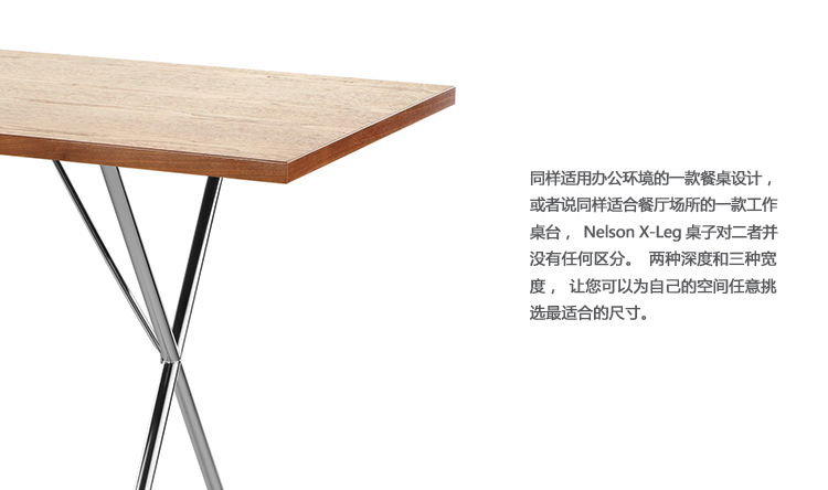同样适用办公环境的一款餐桌设计,或者说同样适合餐厅场所的一款工作桌台,Nelson X-Leg桌子对二者并没有任何区分。两种深度和三种宽度,让您可以为自己的空间任意挑选最适合的尺寸。