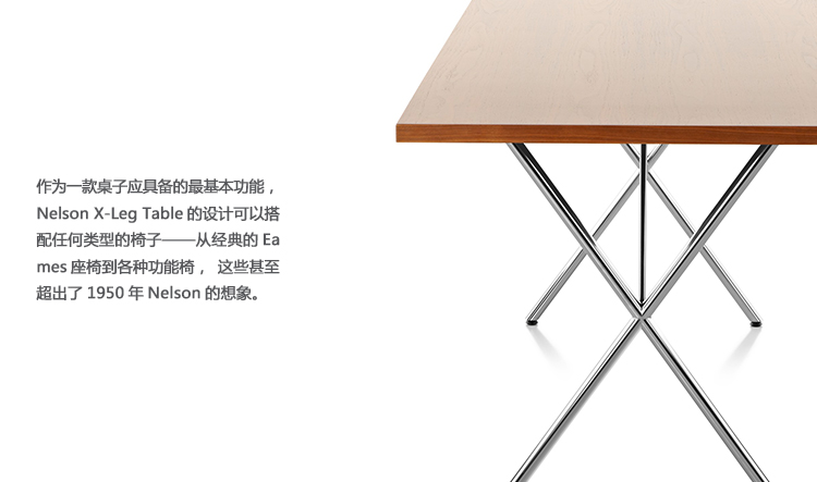 作为一款桌子应具备的最基本功能,Nelson X-Leg Table的设计可以搭配任何类型的椅子——从经典的Eames座椅到各种功能椅,这些甚至超出了1950年Nelson的想象。