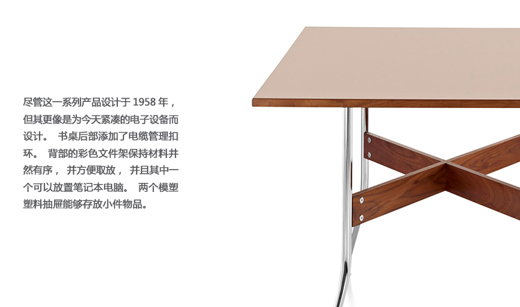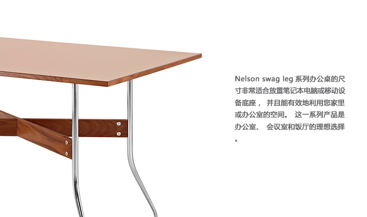 在George Nelson设计出Nelson swag leg系列产品50年后重新推出这款经典产品,主要是因为不管是其外观、尺寸还是功能都非常符合现代顾客的要求。这款办公桌的尺寸非常适合放置笔记本电脑或移动设备底座,并且能有效地利用您家里或办公室的空间。这一系列产品是办公室、会议室和饭厅的理想选择。