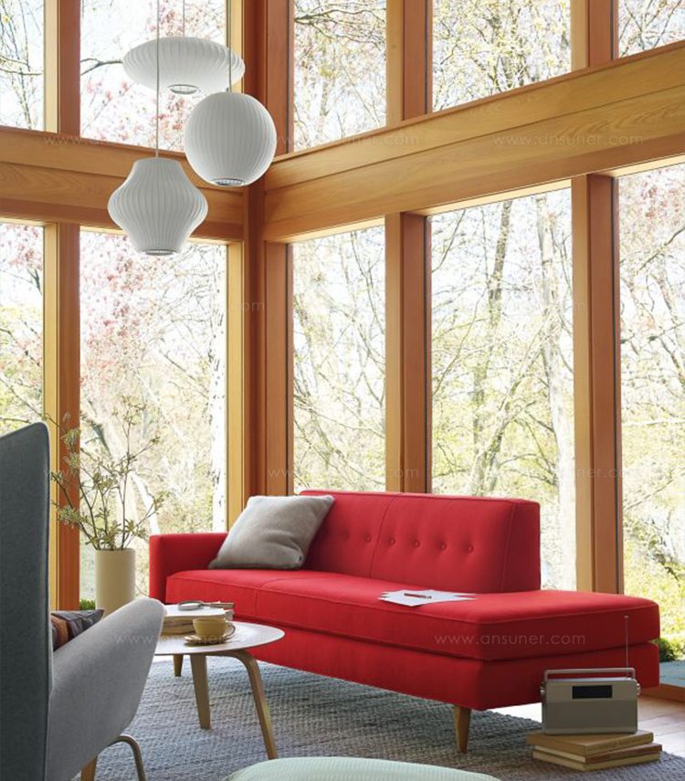 Nelson气泡灯具有迷人的球状轮廓,能为室内设计增添一缕温婉柔美的光彩。球形气泡吊灯可提供三种尺寸,其浑圆的球形部分通过一根6英尺的吊绳悬挂在吊线板上。气泡灯最早设计于1952年,当时Nelson被一组瑞典吊灯深深吸引。其令人望而生畏的高昂价格让Nelson当即就想要设计自己的作品,但通过某种方式让这些灯更加经济实惠。其结果是一系列灯具的面世,这些灯具以一些自然的球状外形为特色,比如圆圆的苹果、加长的雪茄和造型优美的梨等。