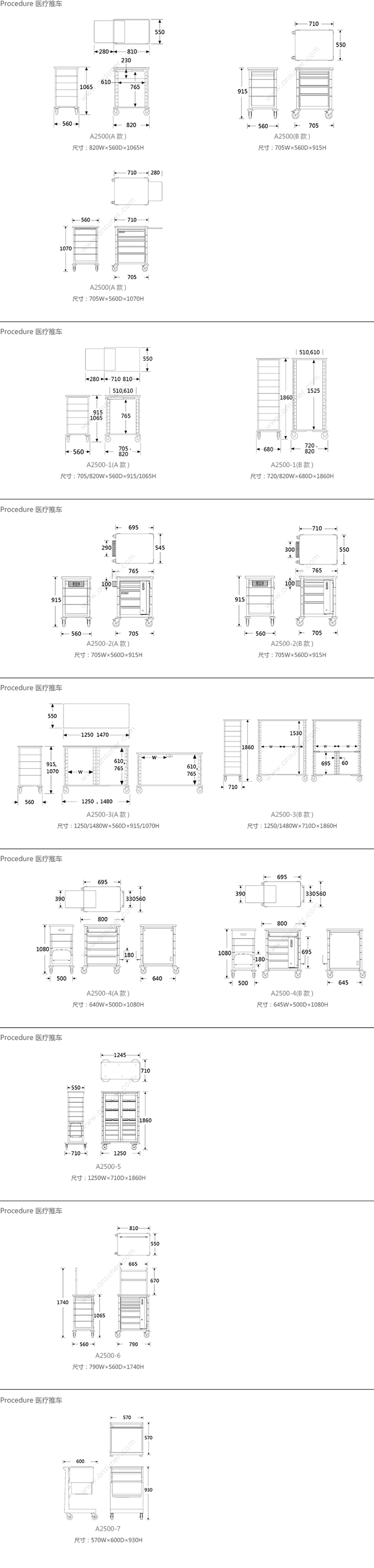 Procedure 医疗推车 系列尺寸/示意图