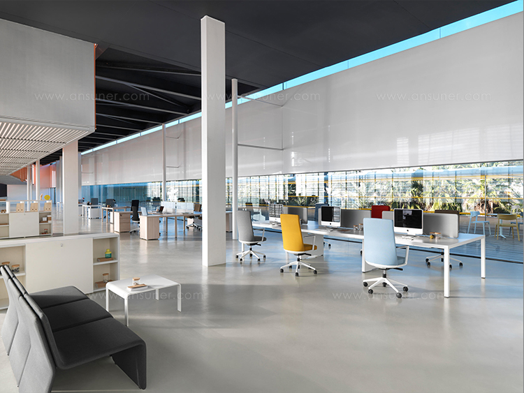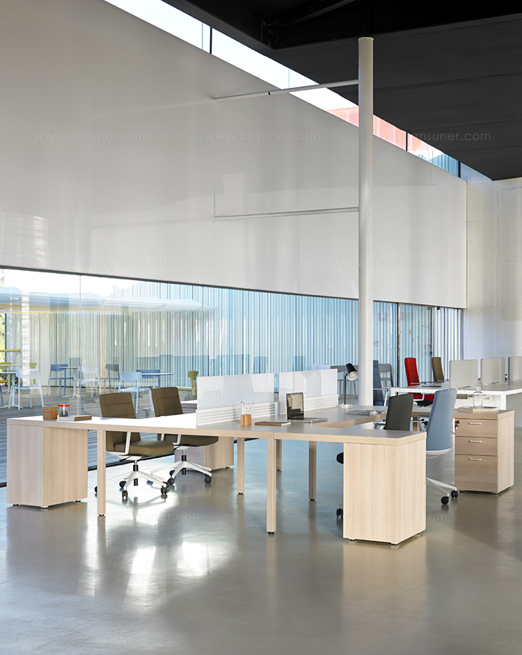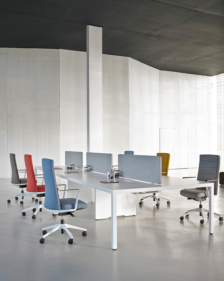 三聚氰胺制成的桌面由50mm ABS塑料封边,软垫形的隔音材料屏幕固定在办公桌面上,提供“T”、“M”和“F”等类型织物以供选择