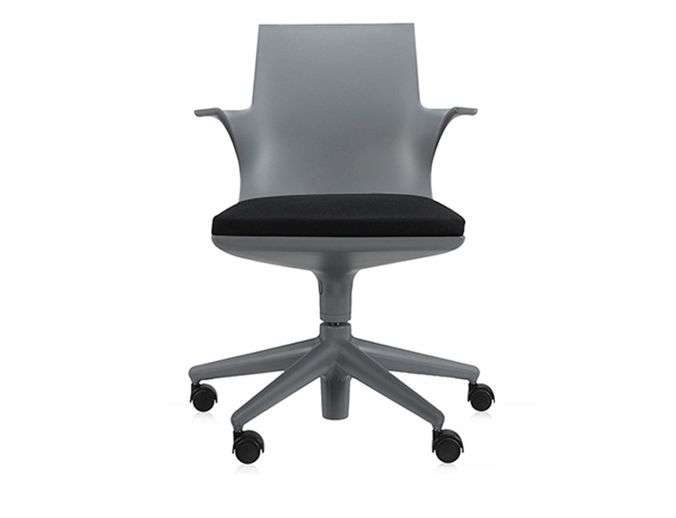 Spoon Chair(汤匙椅)是由意大利设计师Antonio Citterio于2002年为Kartell公司设计的,纤细弯曲的线条勾勒出类似于勺状的外型,配置两个舒适的扶手。此凳的创新之处在于连接座身与凳腿的一个支撑部分,其主要依靠一个由塑胶材料制成的弹性弯曲装置,其可以抵抗重量所带来的压迫与张力;另一个支撑是一个把手的形状,其安放在凳腿的下部,是一个可调节的气压泵装置。因此,其可以在56-76cm之间进行上下调节。Spoon Chair(汤匙椅)是一个将工业科技运用到设计领域的具体实例,其座身、凳腿及底座都是由多种颜色的热塑性塑胶材料制成,中间的茎干(只有当凳子升到最高位置时才会看到)是由阳极氧化铝制成。其颜色分为:白色、黑色、红色、银灰色等。Spoon Chair(汤匙椅)适用于多种不同的环境使用:家庭、办公室、酒吧、时尚餐厅等。