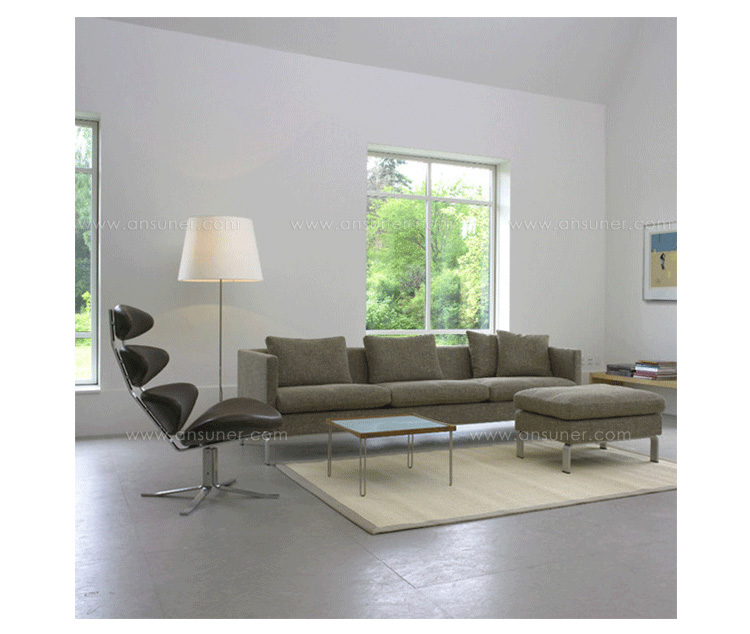 Poul M. Volther 于1964年的设计的王冠躺椅家具系列,是Poul M. Volther最知名的现代家具设计作品,此系列包括Corona Lounger Chair(王冠躺椅)、Corona Lounger Ottoman (王冠休闲脚踏)及其组合Corona Lounger Chair and Ottoman(王冠躺椅&脚踏)。历经40余年的今天,其作品在纷繁现代家具设计中仍占有一席之地。椅子充满了雕塑感,斯堪德维亚风格的简洁外形和舒适的坐感都是这张椅子成为创世之作的原因,四个椭圆形组成一张独特的椅子,无论摆放在哪,都令人过目不忘。此系列家具采用高强度钢材制作,表面电镀处理,外面为真皮或布艺制作,可360度旋转,不可后仰。适用范围广,酒店、会所、高档餐厅、夜总会、别墅等。