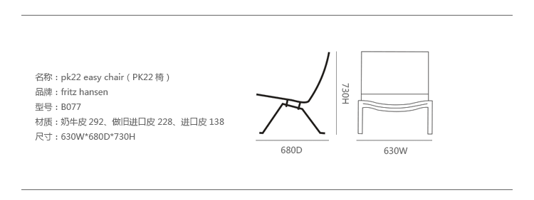 PK22 Easy Chair(安乐椅)是Poul Kjaerholm设计的,和PK20同为PK系列作品,是设计师众多作品中最具代表性的作品之一,PK22椅子外形独特、结构简单、坐感舒适,无疑是现代家具中具有代表性的作品之一,设计师以罕见的设计气质,将功能主义的逻辑理性与北欧的设计感觉天衣无缝地融合在一起,再通过对使用的各种材料和技术构造方面的准确无误的掌握,创造出一种非常纯粹的设计美学。