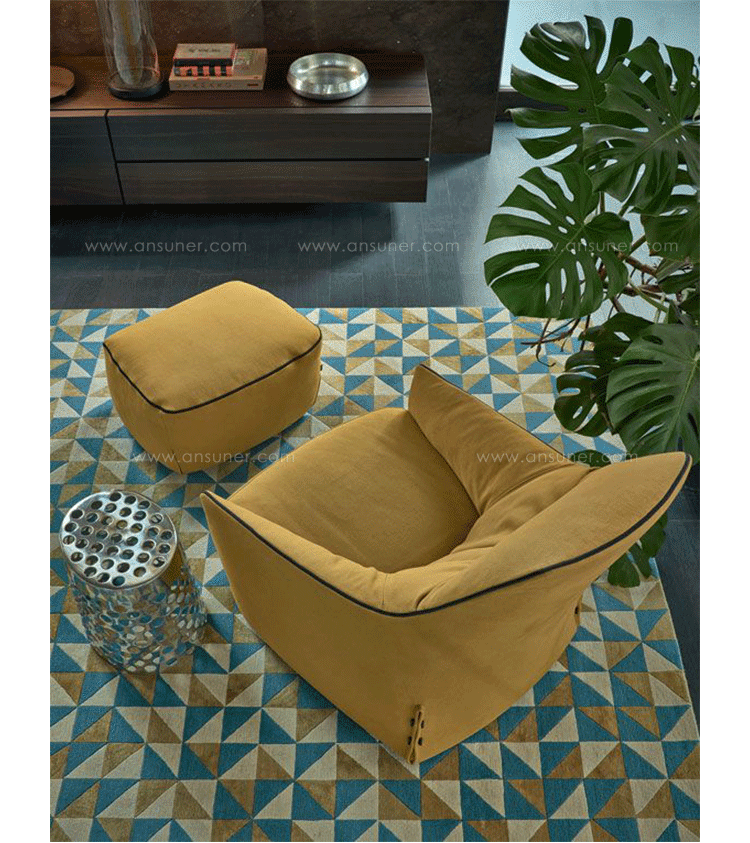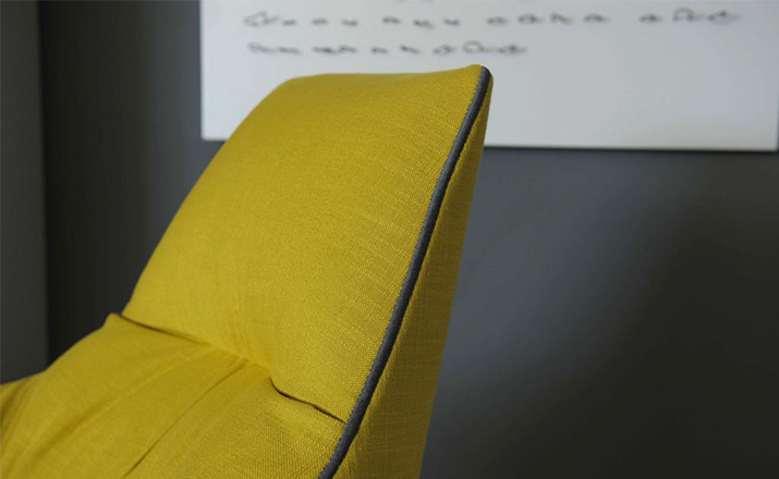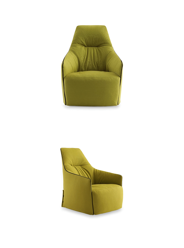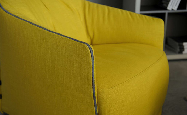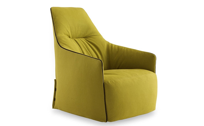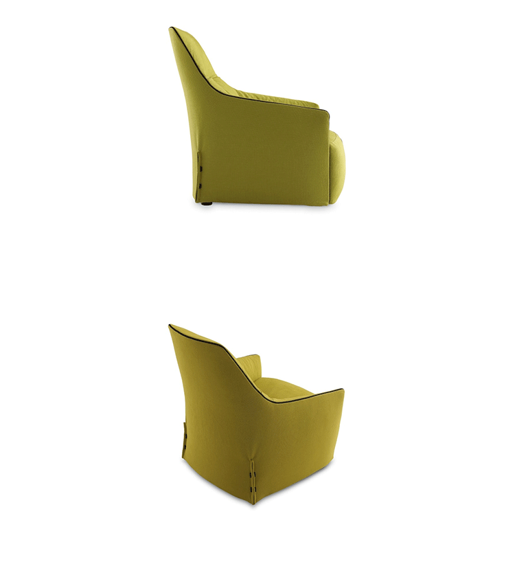 "The Santa Monica Lounge armchair,characterized by a unique design,is a project conceived by the French designer Jean-Marie Massaud,and it is produced by Poliform,a leading company in the made in Italy furniture manufacture.The Santa Monica Lounge armchair on sale in our showroom is matched with the Santa Monica ottoman.Both the items are covered in fabric,yellow colour,with iron coloured stitches."