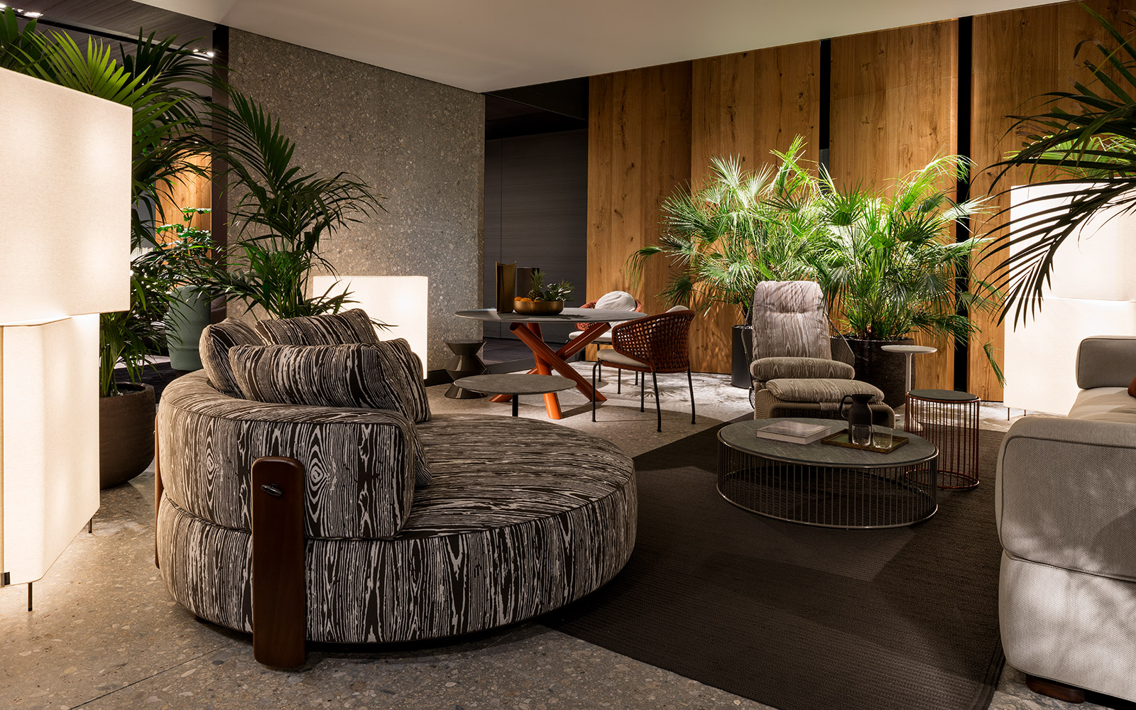 Aston是一个单品家族系列,其中包括沙发、沙发床、扶手椅、脚凳、座椅,为家居环境和“共享空间”提供优雅而时尚的装饰,在室内和室外皆可应对自如。阿斯顿“绳”户外系列采用金属材质的构架,搭配Pewter色聚酯漆面,部件都针对户外环境而经过特别处理,覆面采用疏水性纤维面料。靠背采用直径为7毫米的特殊聚丙烯纱线编织而成,两种颜色可供选择:浅灰色和深棕色,与全新Art Lifescape 02系列的面料和Alison “Dark Brown”户外系列的色调相得益彰。针对户外环境的特点,金属构架经过特别处理,搭配Pewter色聚酯漆面,覆面采用特殊聚丙烯纱线编织而成,有两种颜色可供选择:浅灰色和深棕色。坐垫采用Minotti Studio独家设计并通过激光加工而成的几何装饰。靠垫的内部填充物是高弹性聚氨酯泡沫,覆面采用疏水性纤维面料。