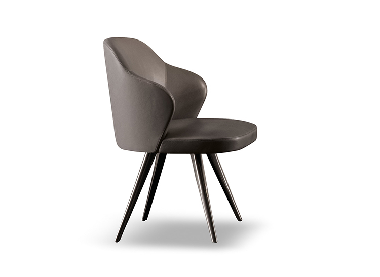 莱斯利“餐厅”小扶手椅展现出圆润而又迷人的造型和同名扶手椅的平衡比例。其特点在于冷模注塑而成的弧形靠背,搭配柔软的填充物。一丝不苟的覆面工艺打造完美的外观效果。Leslie “Dining”可以完全采用织布覆面或者皮革覆面,也可以选择混搭,靠背为织布覆面,坐垫则包覆皮革,体现两种材料之间的完美对比效果。Leslie “Dining” 小扶手椅有三种样式:Pewter色漆面的钢制固定基座,或是Pewter色漆面的压铸铝支撑腿。旋转式基座也采用Pewter色漆面的压铸铝支撑腿。