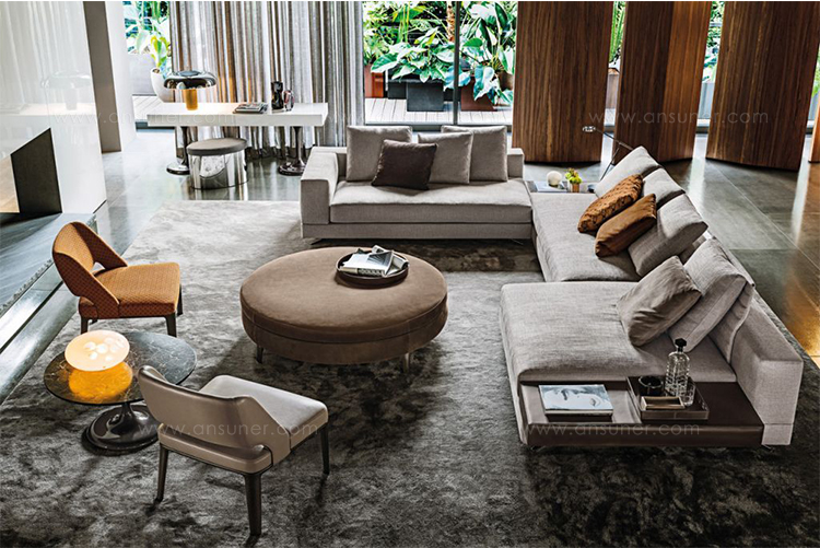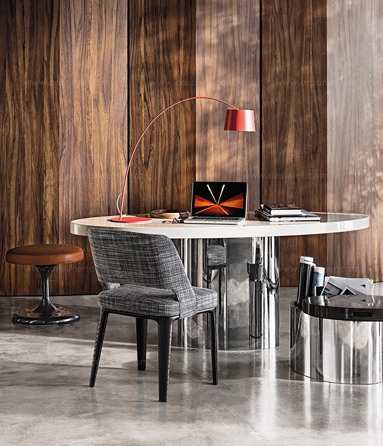 这款产品属于Raymond系列,但是又自成风格,可以作为边几也可以成为座椅,其内部还有一个极为实用的杂志收纳空间。收纳凳的底部为黑色皮革饰面,印有Minotti的logo。上方部件采用亮光漆面,颜色为白色、Sand色、花岗石色、绿色和紫色,搭配实用的椭圆形内嵌手柄,以此可轻松提起顶盖。休闲凳版本的上方部件则添加填充物,包覆Minotti独家系列中的布料和皮革。