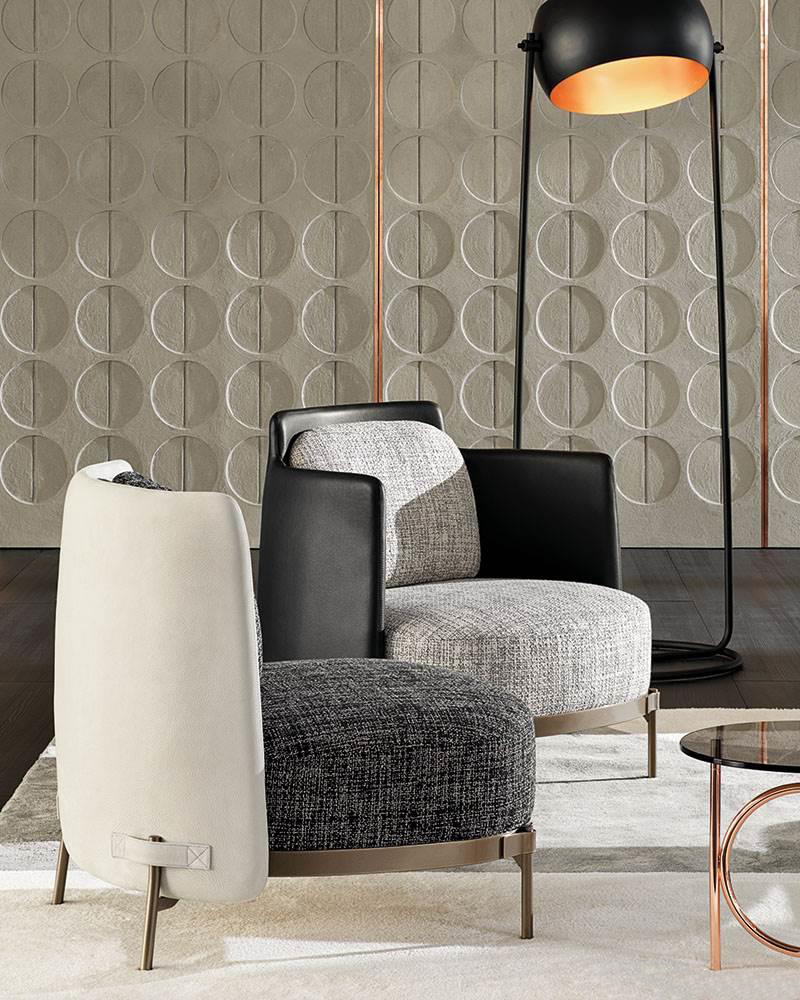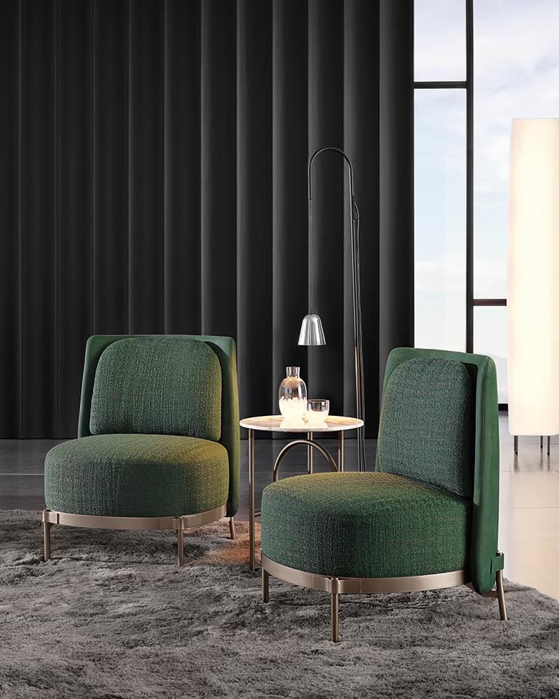 这种金属框架,有轻青铜、铜或黑镍,有不同的高度。圆桌由椭圆形或圆形顶部完成,直径不同,可在青铜玻璃、卡拉卡塔大理石或甘草刷灰中定制。