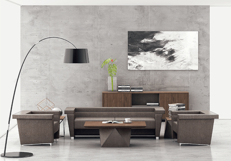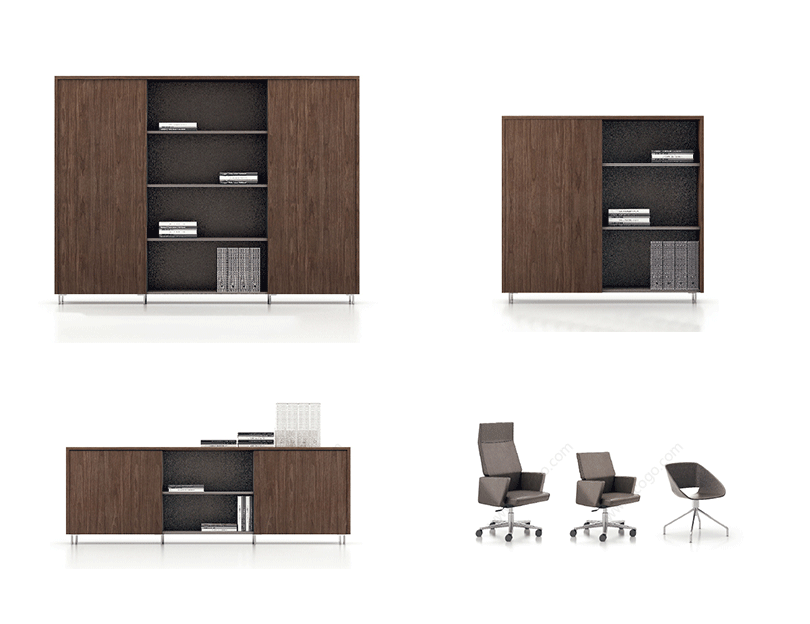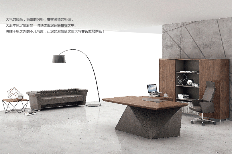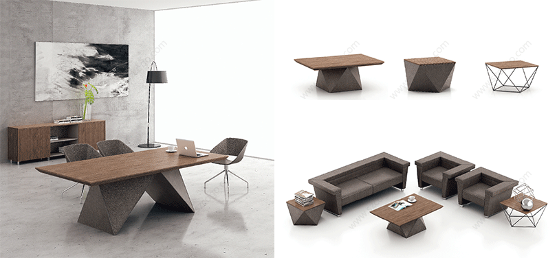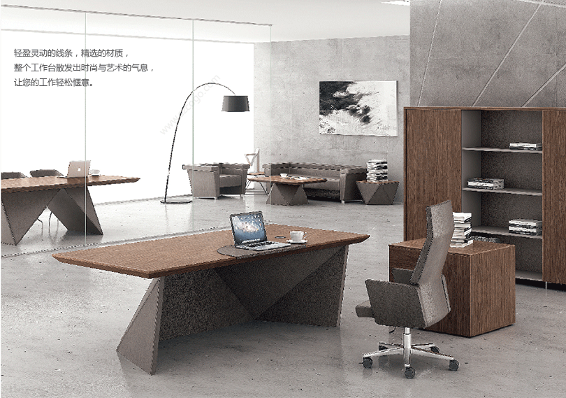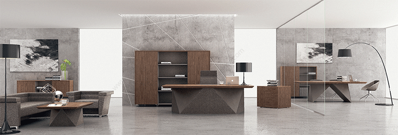 威睿系列,最大的亮点是独特的切割面。打破整体划一的家具造型模式,采用几何体构造设计手法,大尺度楔形宽体切面造型,如钻石的刻面与腰面错落有致,造出流畅的线条感。将现代建筑设计元素融入现代办公空间,结合整体布局配套延展,打造办公家具时尚前沿。主桌采用皮木覆膜工艺,机车缝合明线效果处理,浅胡桃皮木与皮椅搭配,整个空间充斥着个性化对比,金属材质简洁明快,流露出一种低调的奢华与睿智,配合银灰色的空间墙面,使得办公家具与整体的风格一脉相承。"
