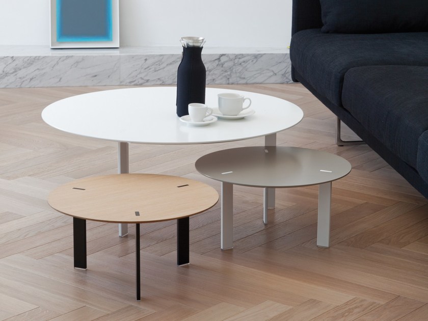 桌面采用漆面MDF或橡木贴面,由Viccarbe提供的饰面和带透明尖端的漆钢腿。