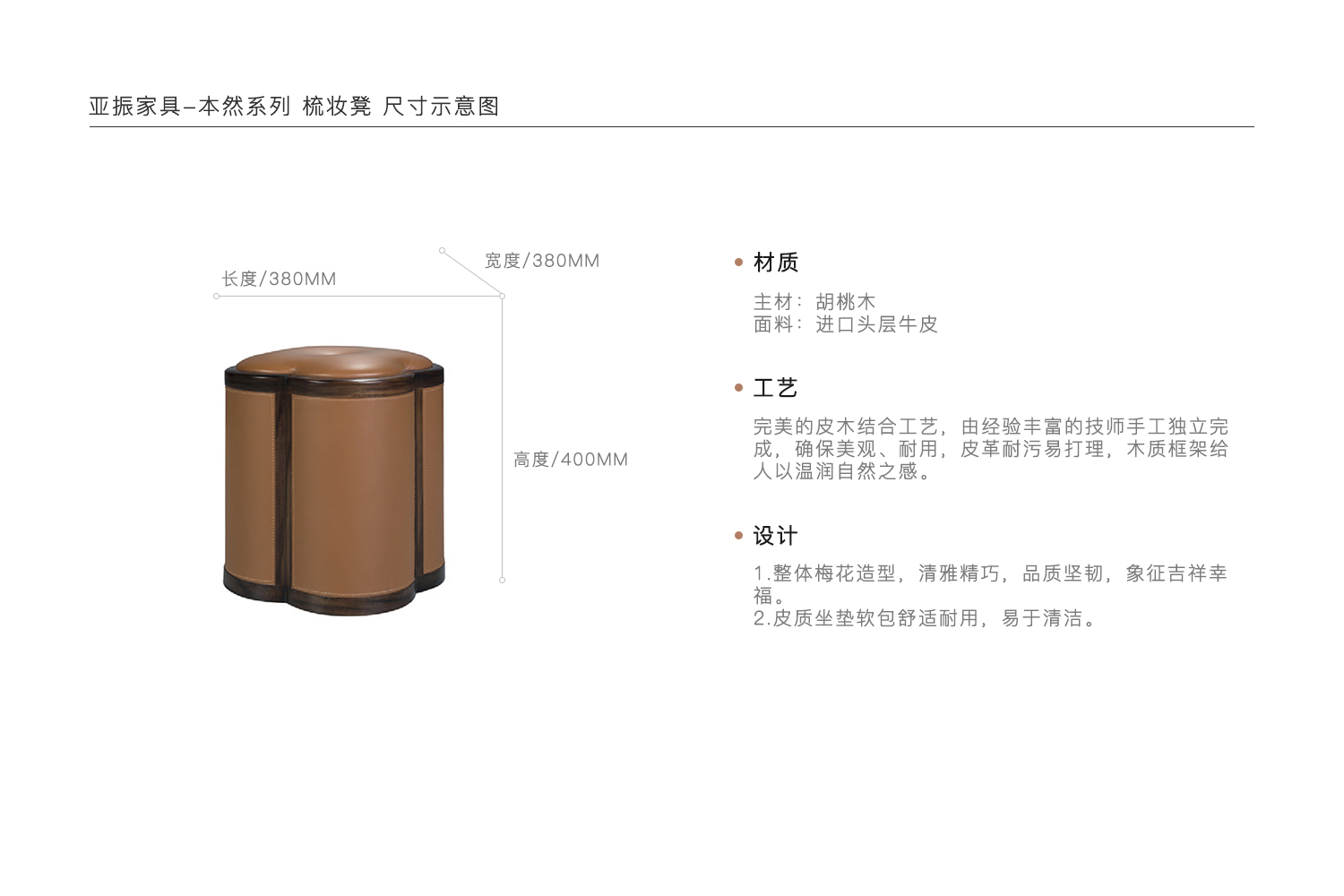 1.整体梅花造型,清雅精巧,品质坚韧,象征吉祥幸福。 2.皮质坐垫软包舒适耐用,易于清洁。