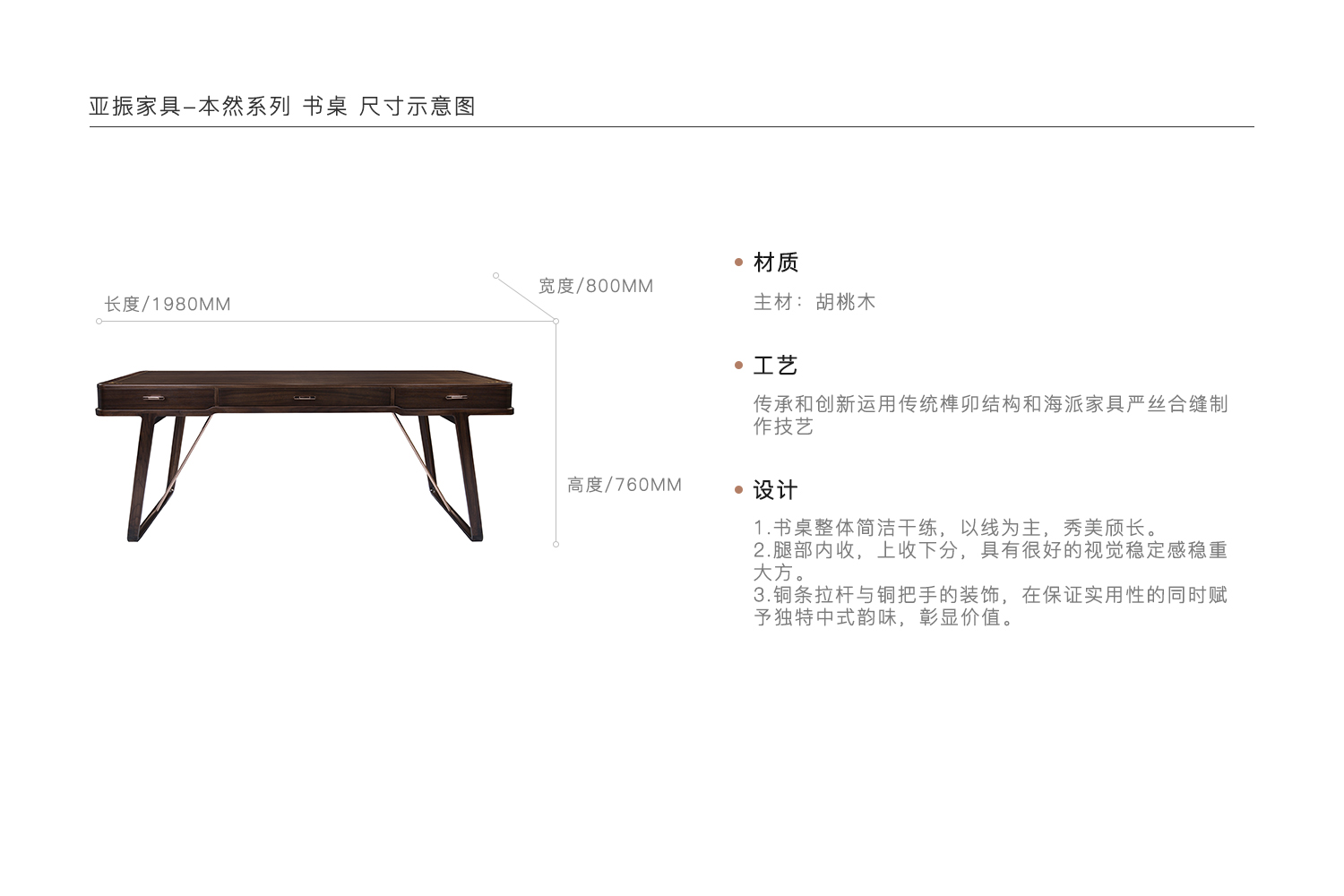 1.书桌整体简洁干练,以线为主,秀美颀长。 2.腿部内收,上收下分,具有很好的视觉稳定感稳重大方。 3.铜条拉杆与铜把手的装饰,在保证实用性的同时赋予独特中式韵味,彰显价值。