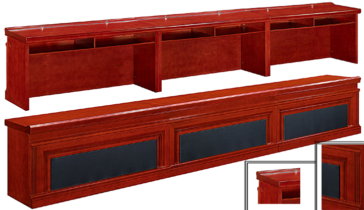 ※ 上图为系列配套主席台的展示,以及配套的大班椅,主席台配带写字板皮垫,以及前挡板精湛的雕花工艺;