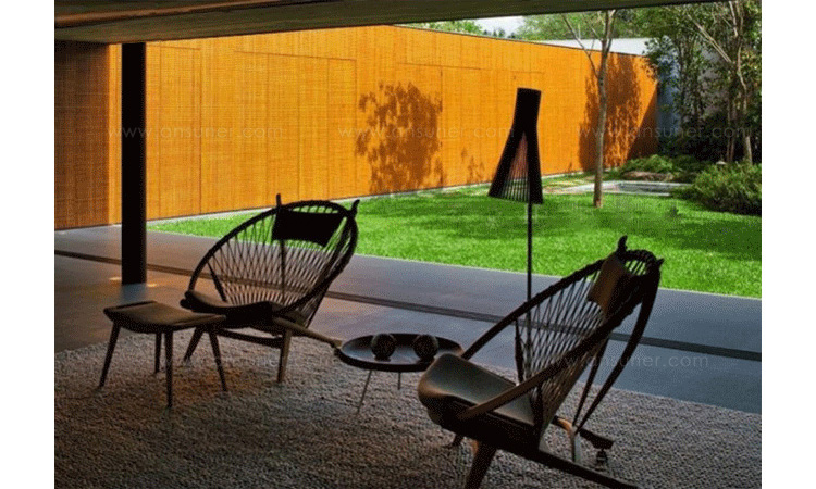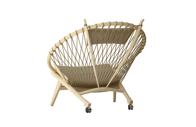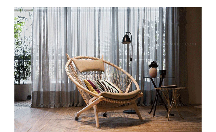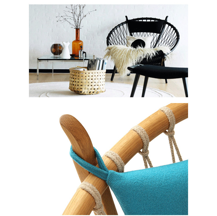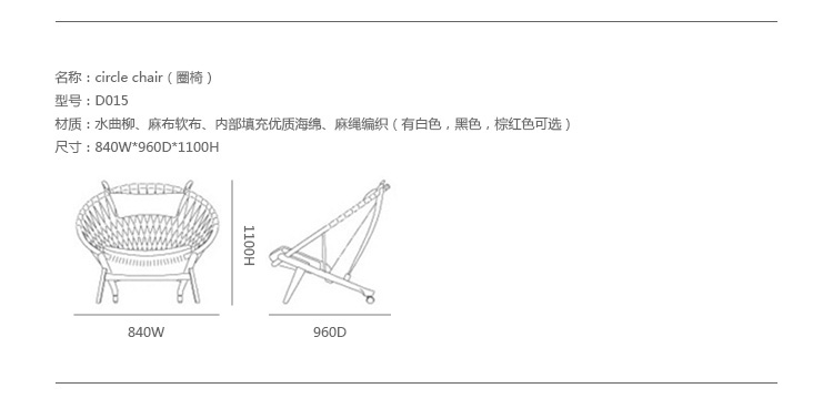 Circle Chair(圈椅)是Hans J.Wegner设计的经典作品之一,他的设计不跟随潮流,尊重传统,承袭文化,欣赏自然;是一种富于“人情味”的现代美学。Circle Chair(圈椅)的椅背是由一个圆形木质箍圈和手工编织绳索构成,网状椅背富有弹性,清凉舒适,椅座可坐两人,无论是情侣还是父母与孩子,都可亲密的坐在一起,这也是圆椅非常吸引人的特别之处。水曲柳或胡桃木木椅身,椅背网纯手工编织,枕头垫和座垫为布面。