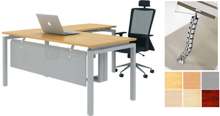※  上图为职员桌正面图,采用现代简约的风格,以斑马木和喷塑不锈钢结合,丰富走线完美结合的集成功能设计展现,给人一种不受约束的感觉,丰富的多颜色选择,也是此款桌子的优质特色。
