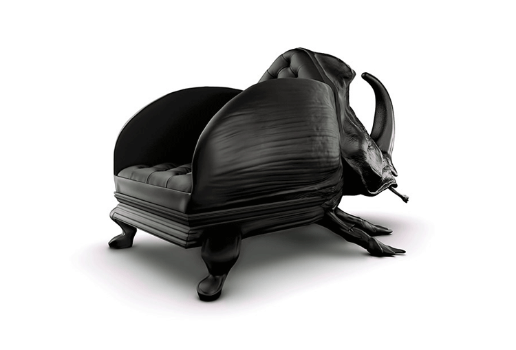 "西班牙设计师 Maximo Riera 设计了一组包括章鱼、犀牛、海象、狮子等在内的 15 件动物造型座椅系列皮椅。这个系列的动物椅集合了不同的物种,从哺乳动物到爬行动物,甚至包括昆虫。每个设计都保留了动物的自然活力,同时又准确还原动物的外观特征。这些动物椅的初衷是一种尝试,希望以动物的栖息来反映和捕捉大自然的美,并向我们星球上的整个动物王国致敬。设计师除了表现动物的野性美,也在善意的提醒人们要维持生态的平衡,尤其对濒危物种多加关注,以实现人与自然的相互依赖和谐共存。这次他的动物王座再添一员——限量版甲虫椅(Beetle Chair)。不要会错意,这个甲虫既然能成为暗黑帝国的一员,当然也不会是可爱傻气的七星瓢虫造型,这个甲虫长著大大的角,背上还突起坚硬的盔甲,六只带刺的脚配搭著獠牙,又是一副狰狞面孔,和之前的设计非常统一。甲虫椅子中集合内一个新的转折,欢迎广大昆虫物种,这是地球上最多样化的群体动物。 关于设计,座位部分位于外壳内覆盖翅膀,形成骨骼和保护动物。 甲虫的形态适应的审美功能,允许框架的构成和外在的数据被认为没有任何中断。"