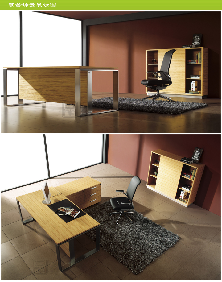 ※ 上图为大班台细节展示图,不锈钢拉丝脚架,实木挡板组合,移动皮革写字板,可选配线盒,舒适,清爽的办公环境,方便快捷的提高着工作效率。