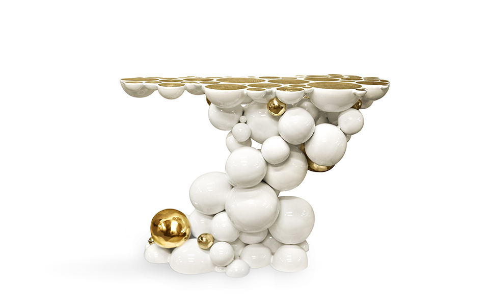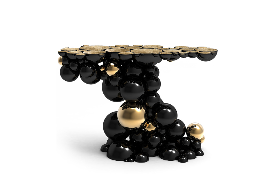 After our recent outstanding moment of inspiration - the creation of Newton dining table - we conceived a console inspired by this exclusive piece of furniture. Once again, we defy the laws of physics and redesigned this monumental console made from aluminum and lacquered in black, with a high gloss varnish. The spheres and semi spheres that complete this futuristic console are gold plated. This intriguing console is ideal for any modern living rooms, bedrooms and hotel lobbies characterized by luxury interior design furnishings.
