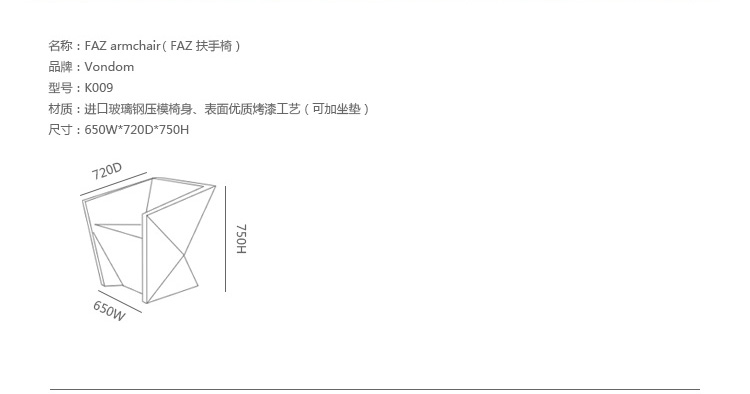 FAZ是西班牙著名建筑师Ramon Esteve为VONDOM公司设计的组合家具和花盆系列。Ramon Esteve是和谐的,平静的和永恒的建筑师,创造了一个矿物质的,表现力丰富的形状,;令FAZ跟我们的家或其他环境完美融合。气氛,包围的结果是材料和光线元素幸福的组合,其独特的察觉是气混合体。他们的灵魂,VONDOM,他的独家性是他原材料的品质,允许,甚至在最苛求的环境使用。FAZ的组合性允许消费者灵活的组合他们的家具和花盆,来适应他们的风格,但并没有失去这家具系列的和谐。FAZ,由辅助桌子,扶手椅子,组合沙发和咖啡桌子,还有三个不同比例的花盆组成。这个系列还配套了最优质的户外坐垫。FAZ,他的结果是表现本质,包含复杂性和密度性,直到极端细节的杰作,其目的是创造一个我们向往的居住地。
