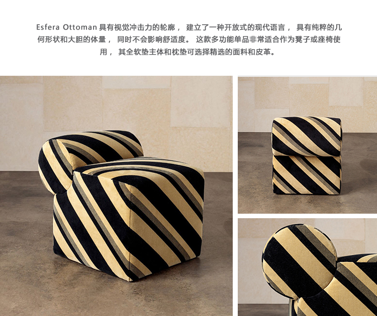 Esfera Ottoman具有视觉冲击力的轮廓,建立了一种开放式的现代语言,具有纯粹的几何形状和大胆的体量,同时不会影响舒适度。 这款多功能单品非常适合作为凳子或座椅使用,其全软垫主体和枕垫可选择精选的面料和皮革。