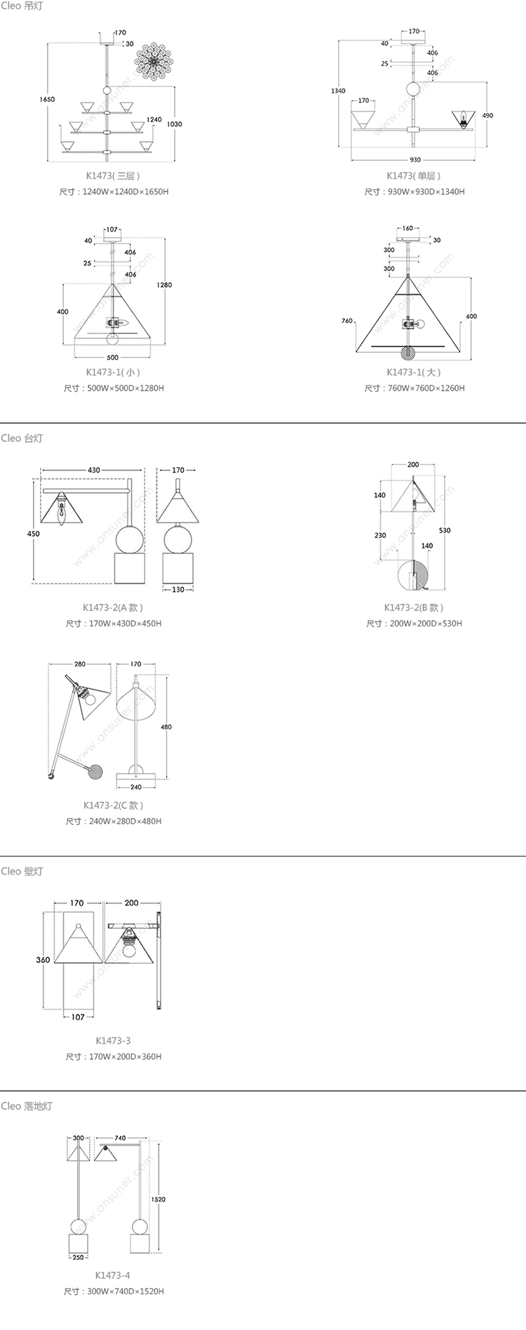 Cleo 吊灯 系列尺寸/示意图
