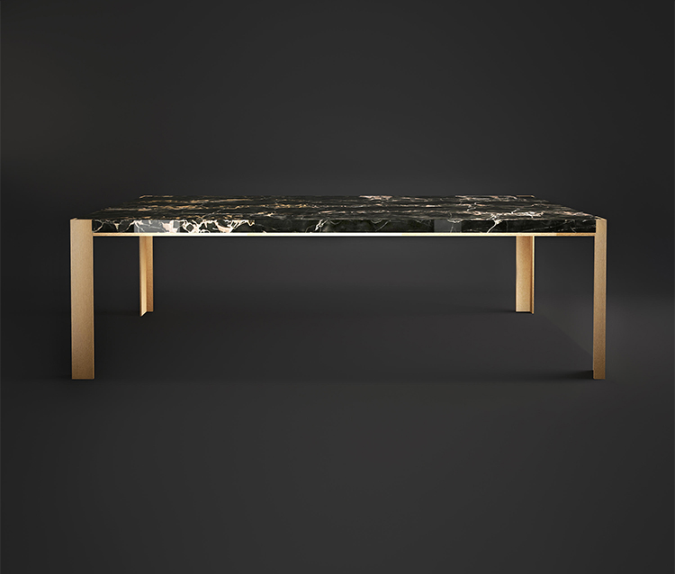 Stuart同时精致而简约,但最令人惊讶的是其结构的材质:它采用黑色大理石台面和拉丝黄铜框架。 大理石纹理的温暖阴影增强了它的清醒。