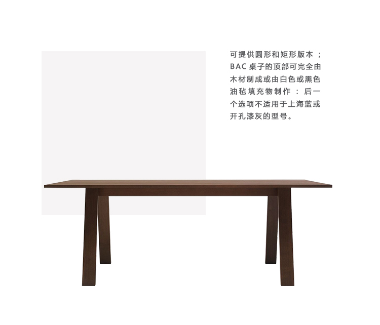 可提供圆形和矩形版本;BAC桌子的顶部可完全由木材制成或由白色或黑色油毡填充物制作:后一个选项不适用于上海蓝或开孔漆灰的型号。