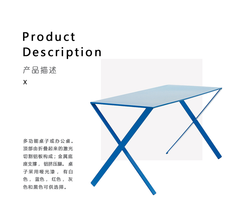 多功能桌子或办公桌。 顶部由折叠起来的激光切割铝板构成; 金属底座支撑,铝挤压腿。 桌子采用哑光漆,有白色,蓝色,红色,灰色和黑色可供选择。