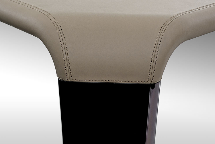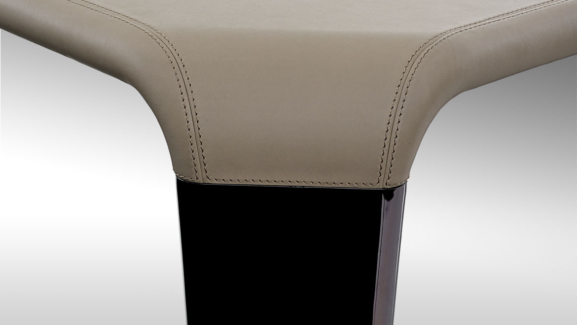Ebony Macassar with diamond drawing matt finishing. Spacer-joint undertop in glossy brushed wood coordinated with the leather top, matt or polished