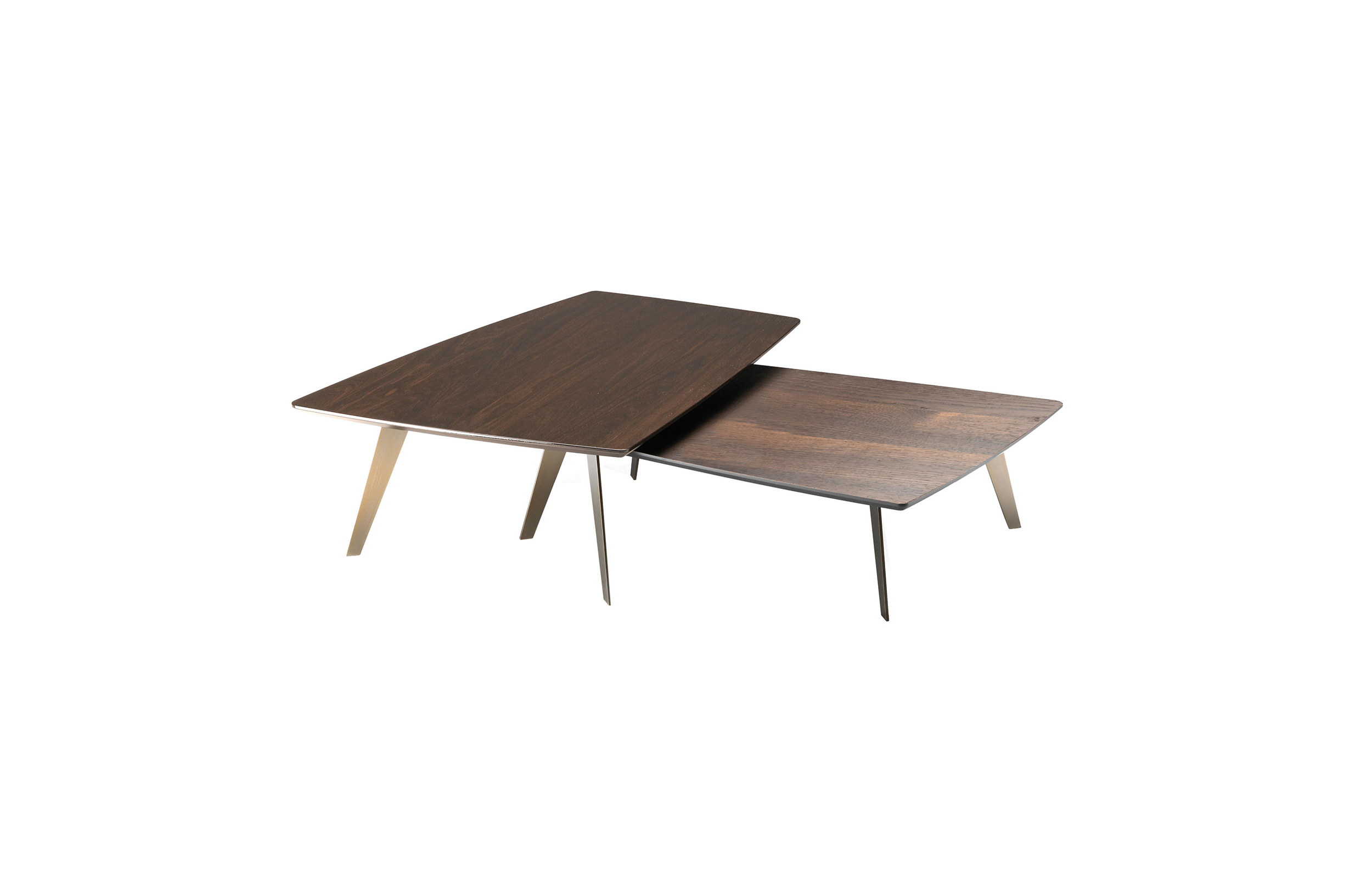 现代和都市的灵感存在于市中心,集合包括咖啡桌、边桌和控制台。这是一种设计配件,在莫卡橡木或苏库皮拉的薄木上,由一种由微小的金属结构支撑,这种金属结构是由微米的棕色或钛金属制成的。咖啡桌的两个顶部可以旋转180度,以提供更实用的用途。