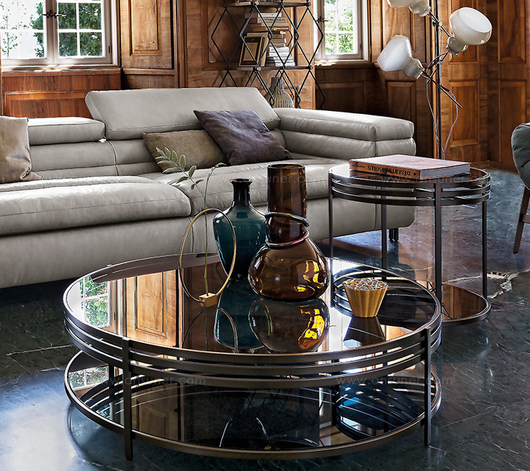 一系列的小桌子,突出了优雅的结构,用抛光的不锈钢或黄铜制成,并以温和的烟熏玻璃为顶部。