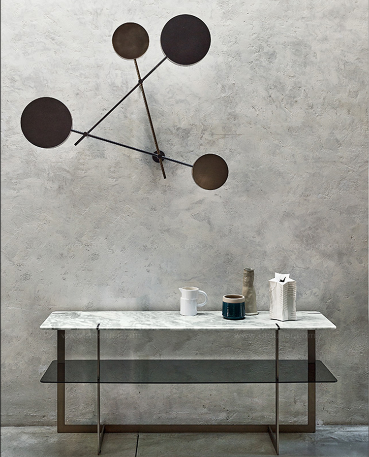 Iride是一个线条和圆圈的雕塑,几何形状的强烈的装饰效果,让你想起了康定斯基年代作品。圆盘形成了一个类似于日食的发光的光环。交错的结构是由三个圆盘和三个云母棕色金属棒和一个钛金属圆盘和棒制成。