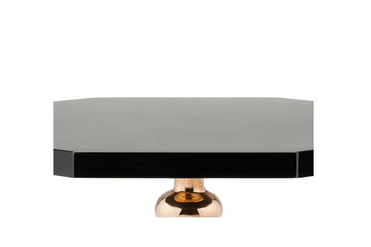 这张桌子上有一个古色古香的青铜底座和一个八角形的顶部。