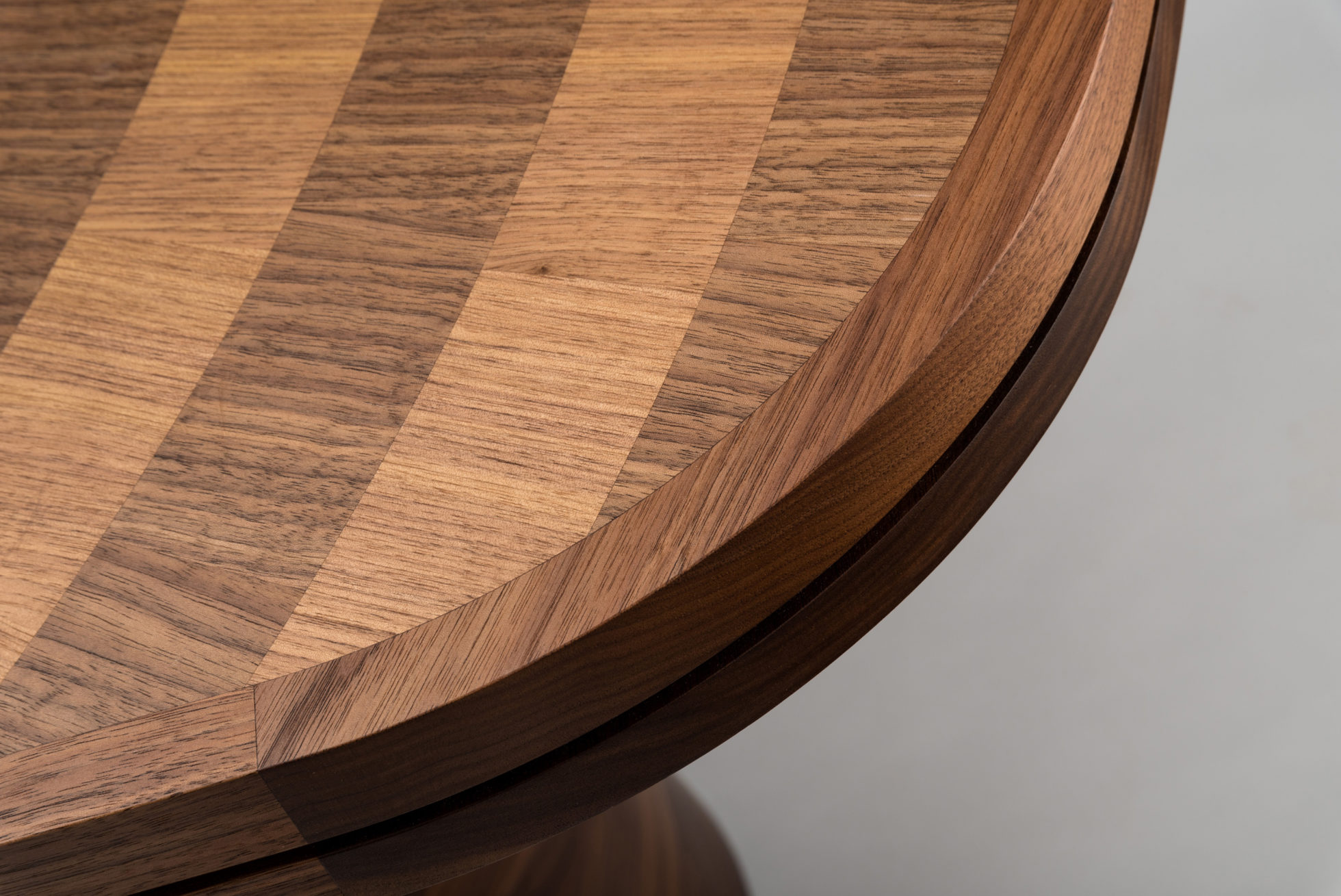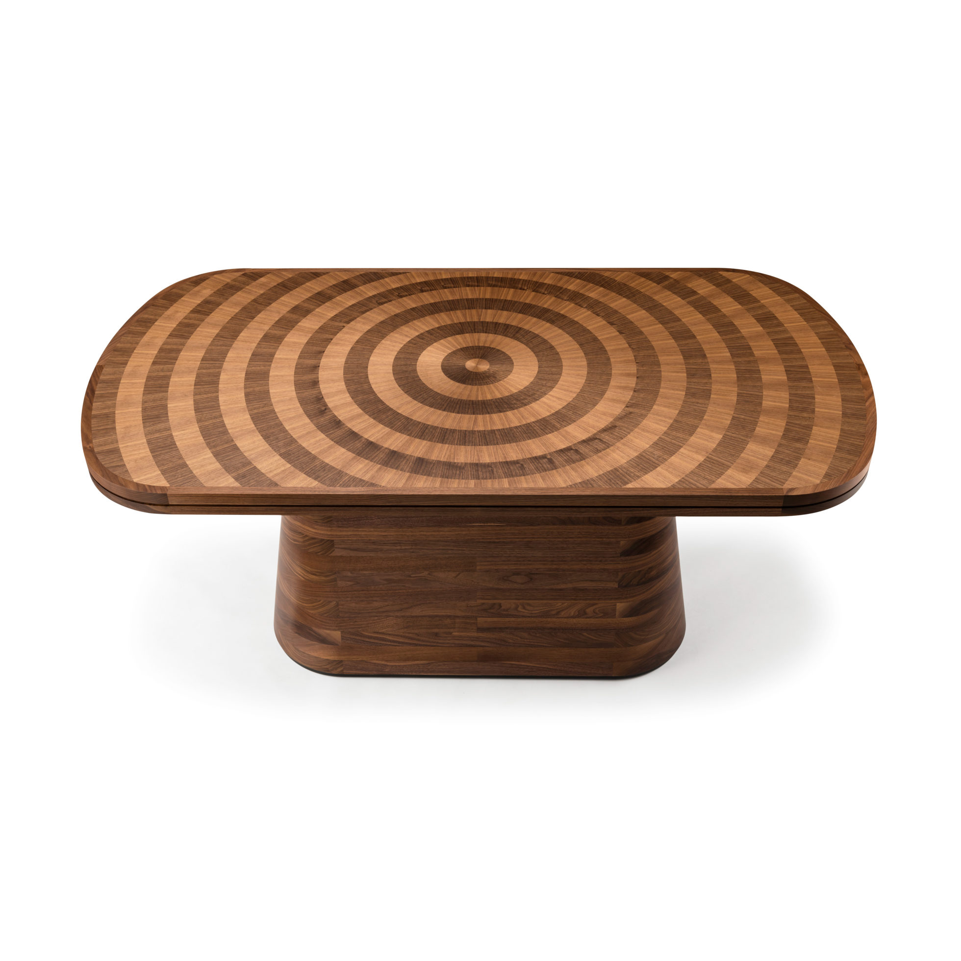 光芒四射的浅色和深色胡桃木饰面突破了我们超凡脱俗的Astral餐桌的表面,它们的生命环仅由坚实的胡桃木装饰和锚固基座限制。