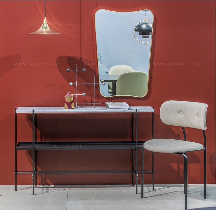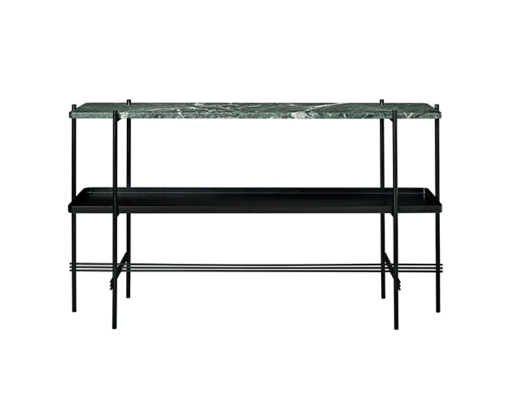 TS装饰架有两个版本——TS装饰架1和TS装饰架2。TS装饰架1有一个大理石托盘和TS装饰架2有两个大理石托盘,或一个大理石托盘和一个金属托盘。在两者上,一个黑漆框架是对比大理石顶部。