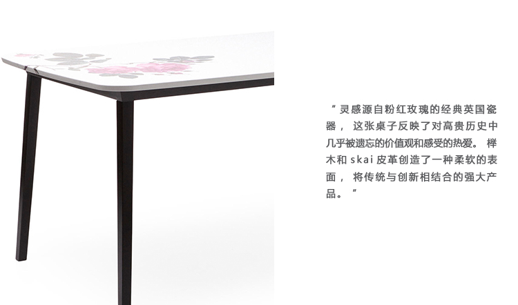 “灵感源自粉红玫瑰的经典英国瓷器,这张桌子反映了对高贵历史中几乎被遗忘的价值观和感受的热爱。榉木和skai皮革创造了一种柔软的表面,将传统与创新相结合的强大产品。”