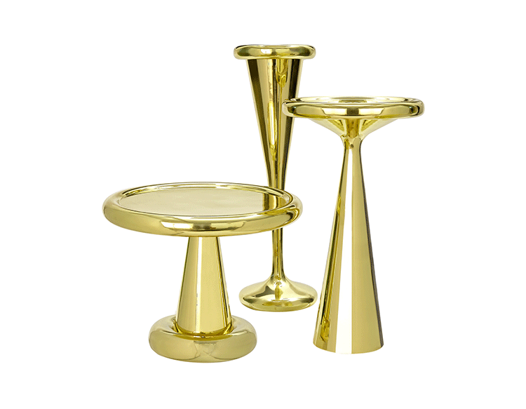 由Tom Dixon Space age, Art Deco or Pop设计的2013 Spun-sheet solid brass bronze——这三件极具表现力、偶尔会出现的家具,每个人都看到了不同的影响。她说:“这是一件非常漂亮的作品。它的比例非常大,用手工抛光的纯黄铜薄板做成的曲线状,使鸡尾酒吧、餐厅或客厅立刻焕发出迪斯科的魅力。”