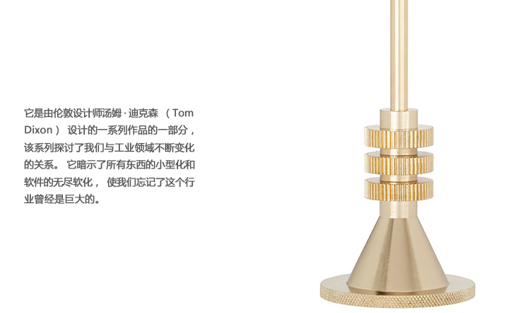 Cog是一个烛台,有两种大小,是由滚花盘,锥,棒和齿轮制成的。尽管不是在英国制造的,但它笔直而真实地证明了伟大的英国工程时代。讽刺的是。从固体铝,然后黄铜镀,它的表面重量掩盖了它的重量。这是一个系列的一部分,伦敦设计师汤姆·迪克森(Tom Dixon)的作品,探讨我们不断变化的关系与工业景观。它暗示着一切事物的小型化,以及器皿的无止境的软化,使我们忘记了工业曾经是巨大而不妥协的,吵闹和喷涌,其残酷的美丽令人恐惧,同时也是现代信息时代的先兆和先驱者。人们想了很多,但说的还不够多,汤姆·狄克逊的确是这样的